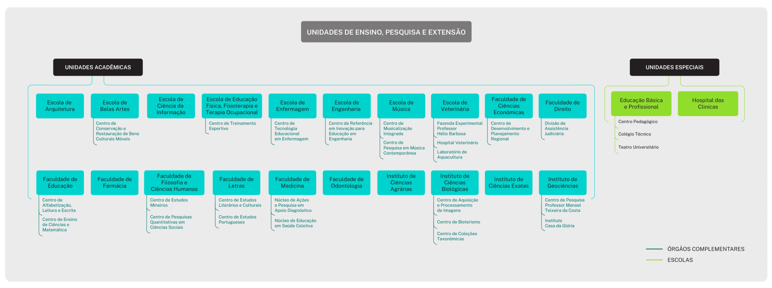As Unidades de Ensino, Pesquisa e Extensão da UFMG são compostas pelas Unidades Especiais e Unidades Acadêmicas, além dos seus órgãos complementares.