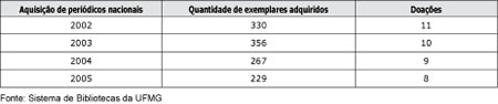 Quadro 11 Aquisição de periódicos nacionais pela Biblioteca Universitária – 2002-2005