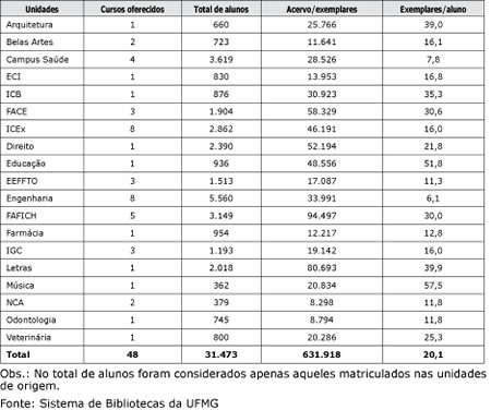 Esses dados mostram que ocorreu, no período, diminuição progressiva do ingresso de livros e periódicos na Universidade, o que pode ser atribuído às dificuldades financeiras por que passam as universidades federais. Além das restrições para manter o acervo atualizado, a comparação entre o acervo bibliográfico de cada unidade e o número de alunos matriculados nos cursos por ela oferecidos, feita no Quadro 12, permite observar uma distribuição não equilibrada, conforme explicitado a seguir: Quadro 12 Proporção entre acervo bibliográfico e alunos, por unidade acadêmica,em 2004