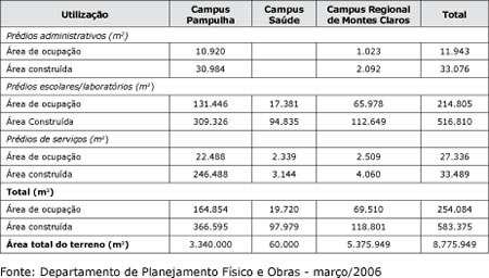 Concebido em 1998 e implementado a partir de 2002, o Projeto Campus 2000 tem dois objetivos: promover a integração da maioria das unidades da UFMG no espaço comum da cidade universitária, no Campus Pampulha, e introduzir melhorias na infra-estrutura de várias unidades. Entre 2002 e 2005, o projeto construiu novas ou ampliou as instalações de cinco unidades acadêmicas no Campus Pampulha: Faculdade de Farmácia, os Departamentos de Fisioterapia e Terapia Ocupacional, e os anexos do Departamento de Química, da Faculdade de Educação e do Instituto de Geociências, totalizando 35.788 m² de área construída. Outras edificações estão sendo executadas, para instalar a Faculdade de Ciências Econômicas e a Escola de Engenharia. No total, esse conjunto de prédios representará um acréscimo de 108.794 m² de área construída. Infra-estrutura das unidades acadêmicas e administrativas Campus Pampulha – Área de Artes Compreende a Escola de Belas Artes e a Escola de Música, e as edificações somam 13.186 m². Inaugurado em 1970, o prédio da Escola de Belas Artes encontra-se em obras para adequação do espaço para as aulas do Curso de Artes Cênicas. Faz-se necessária, ainda, a adaptação das instalações físicas para abrigar novos laboratórios e o Centro de Restauração e Conservação – CECOR, ampliar o setor de gravura e elaborar projeto para construção de salas para a pós-graduação. O prédio da Escola de Música, inaugurado em 1997, está adequado às necessidades do ensino e da pesquisa, necessitando apenas de intervenções para o tratamento acústico e algumas reformulações dos espaços. Para as atividades de extensão, foi construído um anexo, para sediar o Centro de Musicalização Infantil. Campus Pampulha – Área de Ciências Biomédicas A área das edificações soma 124.481 m². Fazem parte desse grupo: o Instituto de Ciências Biológicas, a Faculdade de Farmácia, a Faculdade de Odontologia, a Escola de Veterinária, o Hospital Veterinário, e a Escola de Educação Física, Fisioterapia e Terapia Ocupacional. Nesse conjunto, o prédio que se encontra em piores condições é o do Instituto de Ciências Biológicas. Inaugurado em 1980, as instalações do Instituto de Ciências Biológicas necessitam de reforma geral e manutenção corretiva, além de reformulação e reorganização dos espaços, de salas de aula, administração, laboratórios e auditórios. Os dutos das instalações hidráulicas e elétricas se encontram em estado avançado de deterioração, e é necessária a implantação de um sistema de proteção contra descargas atmosféricas e incêndios. Os espaços físicos também precisam ser ampliados, incluindo instalações adequadas para o Biotério e as Coleções Taxonômicas. Segundo consta do relatório de auto-avaliação da unidade, essas coleções estão armazenadas em condições precárias de conservação, em local impróprio, e mal-acondicionadas. A desorganização e a dificuldade de acesso resultantes geram subutilização e duplicação desnecessária de esforços, além de desvalorização do acervo. O prédio da Faculdade de Farmácia, inaugurado em 2004, encontra-se em boas condições de funcionamento. Aguarda-se a conclusão da biblioteca e do auditório. As instalações da Faculdade de Odontologia, concluídas em 1999, encontram-se em excelentes condições em termos da adequação dos espaços. Para melhorar o conforto térmico, introduziu-se a exaustão eólica nas clínicas e no pátio coberto, e aguarda-se a execução do mesmo projeto na biblioteca, bem como a finalização do auditório. A Escola de Veterinária e o Hospital Veterinário, construídos em 1974, estão com laboratórios, salas de aula e de apoio passando por processo de atualização. Visando contemplar as recentes demandas de ensino e pesquisa, foram construídos novos anexos: o Laboratório de Calorimetria e de Metabolismo Animal, e o Laboratório de Aquacultura. Foram também ampliados e reformados os laboratórios de Análise do Leite, de Bacteriologia e Viroses, e a Clínica de Pequenos Animais. Nas reformas, adaptações e manutenção foram contempladas também as salas de aula e de seminários, a biblioteca, e os espaços administrativos e de apoio. As fachadas e brises necessitam de recuperação, a área de estacionamento deve ser ampliada, com instalação de sistema de segurança, as baias externas de confinamento de animais de grande porte precisam ser organizadas, bem como é necessário construir novos vestiários para os funcionários terceirizados. Identifica-se, ainda, a necessidade de reforma geral na subestação de energia elétrica e a instalação de sistema de proteção contra descargas atmosféricas. O prédio da Escola de Educação Física, Fisioterapia e Terapia Ocupacional foi construído em 1975 e ampliado em 1997, com a construção do Centro de Excelência. Os Departamentos de Fisioterapia e Terapia Ocupacional foram instalados em novas dependências, em 2005. As instalações da escola são condizentes com suas atividades acadêmicas, necessitando de manutenção corretiva na estrutura, pintura das fachadas e esquadrias, e reformulação de espaços em função de novas demandas. As instalações elétricas do prédio mais antigo estão ultrapassadas em relação à tecnologia e normas atuais. Recentemente, foram construídos novos espaços para ensino e pesquisa, como a quadra poliesportiva coberta e a pista de atletismo, e instalado aquecimento solar na piscina. É necessário construir um ginásio apropriado para treinamento de tae-kwon-do, judô, esgrima e levantamento de peso, e um espaço para a atividade extensionista do Projeto Guanabara. Campus Pampulha – Área de Ciências Exatas e da Terra A área de edificações soma 82.826 m², e compreende o Instituto de Ciências Exatas, o Instituto de Geociências e a Escola de Engenharia. O conjunto do Instituto de Ciências Exatas foi inaugur