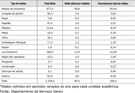 Com relação aos resíduos químicos, foi feito levantamento dos passivos químicos abrigados nas diversas unidades, e solicitado orçamento junto a fornecedores para destinação final. Roteiro de visita técnica para diagnóstico dos resíduos químicos gerados nos laboratórios da UFMG foi aplicado, e foram adquiridos kits de EPIs para utilização nos laboratórios das unidades, e etiquetas para identificação desses resíduos. Lixeiras apropriadas foram instaladas, e se encontram em fase de teste, estando pronto também o projeto de um entreposto para a coleta de resíduos químicos. A implantação do Plano de Gerenciamento de Resíduos de Serviços de Saúde – PGRSS, já produziu os seguintes resultados: acompanhamento, junto à SLU e à Vigilância Sanitária, do andamento do plano elaborado para o Campus Pampulha; proposição de projeto de alteração de módulos de lixo para abrigar resíduos infectantes; contratação de empresa licenciada pela Secretaria Municipal de Meio Ambiente para incineração de resíduos quimioterápicos, antineoplásicos e de anatomia patológica gerados no Campus Saúde, inclusive seus passivos;[41] aquisição de 17 contêineres de lixo para o Campus Saúde, 10 para o Campus Pampulha; desativação das caçambas utilizadas para o acondicionamento temporário dos resíduos nos campi Pampulha e Saúde; e início do levantamento quali/quantitativo da geração de resíduos nos laboratórios instalados no Campus Saúde. Esse Plano prevê, ainda, a construção de um modelo de lixeiras a serem instaladas nas salas de aula e nas áreas comuns do Campus Pampulha. O programa de compostagem, que aproveita e direciona corretamente o reúso de resíduos das áreas verdes, encontra-se implantado em fase experimental. Esse serviço é executado em parceria com o Departamento de Engenharia Sanitária da Escola de Engenharia e necessita, para o funcionamento rotineiro, de maquinário específico e mão-de-obra especializada. Com relação ao tratamento a ser dado aos resíduos de construção civil, foi elaborado o Projeto Canteiro Vivo, em implementação. Conservação e manutenção A manutenção e conservação das instalações prediais são de responsabilidade da Divisão de Manutenção da UFMG, que vem realizando apenas manutenção corretiva, a partir das solicitações dos usuários e de avaliações técnicas, já que não há mão-de-obra nem recursos disponíveis para executar serviços de ordem preventiva. Por essa mesma razão, não existem políticas definidas e/ou implementadas, a médio e longo prazo, para a execução de tais serviços. A grande maioria dos serviços é atendida e custeada por firmas contratadas pelos próprios usuários, dado que a verba do Departamento de Planejamento Físico e Obras (DPFO) não é suficiente para isso, nem sua equipe é devidamente especializada e qualificada para realizá-los. O serviço de manutenção e recarga de extintores de incêndio é terceirizado, e também é afetado pela falta de pessoal especializado para fiscalizar a entrega do serviço. De um modo geral, é necessário qualificar melhor os funcionários desse setor por meio de cursos de capacitação, atualização e do incentivo à participação em feiras. O gerenciamento dos contratos de manutenção, compra e instalação, por sua vez, funciona satisfatoriamente. O serviço de limpeza, tanto do interior das edificações, assim como das áreas externas comuns, é executado por mão-de-obra terceirizada, e está funcionando de maneira satisfatória. Transporte As informações deste item são restritas ao Campus Pampulha, onde é maior o volume de circulação de pessoas. O Campus Saúde, localizado na região hospitalar, é muito bem servido por linhas de ônibus, o mesmo ocorrendo com as outras unidades localizadas fora dos campi. No caso do Campus Regional de Montes Claros, essa questão não representa problema, uma vez que nada foi salientado no seu plano de desenvolvimento institucional, elaborado em maio de 2004. O Campus Pampulha é provido de três linhas de ônibus de transporte público que adentram o território universitário com freqüência considerada adequada, até mesmo nos horários de pico. Parte do acesso se faz também por linhas de ônibus externas, que circulam nas avenidas limítrofes. Os deslocamentos entre às unidades acadêmicas, administrativas, de apoio e o acesso às avenidas vizinhas, completam-se com serviço gratuito feito por ônibus próprio da UFMG. As unidades dispõem de estacionamentos, e há vagas ao longo das vias internas para as pessoas que transitam pelo campus em automóveis próprios. Apenas a região central do campus, que é muito populosa, apresenta, nos horários de pico, problemas com relação ao estacionamento nas áreas próximas às edificações, mas é possível estacionar numa distância entre dois e quatro quarteirões do destino. A proximidade do término das obras da Escola de Engenharia e da Faculdade de Ciências Econômicas gera a expectativa de que tanto o trânsito local, quanto o estacionamento se tornem mais problemáticos, já estando em planejamento o seu equacionamento. O transporte institucional é realizado por meio de uma frota de 214 veículos, baseados no Campus Pampulha. Esse serviço é realizado por 60 pessoas, sendo que 82% delas pertencem ao quadro de funcionários da Universidade, e o restante, terceirizado. O transporte institucional contempla tanto deslocamentos no campus, na cidade, quanto viagens de trabalho. Incluem-se nesse serviço as viagens coletivas, destinadas à realização das aulas de campo e para a participação de estudantes em eventos acadêmicos. Para tanto, são utilizados ônibus que pertencem a unidades ou a projetos acadêmicos. Para o atendimento a esses veículos, a UFMG conta com oficina mecânica e um posto para abastecimento e lavagem. Alimentação Há restaurantes e cantinas no Campus Pampulha e estas últimas, quando loc