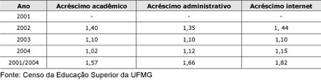 Tabela 41 Rede de computadores da UFMG, acréscimo anual, por tipo – 2001-2004.