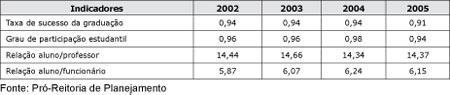 A restrita abrangência alcançada pela expansão de vagas noturnas nesse período, contudo, indica o grau de dificuldade enfrentada pela UFMG para a implementação dessa política. Devem ser consideradas, nesse caso, tanto a falta de envolvimento efetivo com essa proposta por parte de alguns docentes, como as justificadas dúvidas de outros quanto à pertinência de assumir o compromisso de criar um curso ou ampliar vagas, sem a garantia de poder atender a esse compromisso com a qualidade necessária.[46] Essas dúvidas se devem à necessidade da definição de vagas docentes para cobrir as demandas resultantes das novas vagas discentes; à carência de servidores técnico-administrativos para dar suporte às atividades acadêmicas no turno noturno, incluindo atendimento nas sessões de ensino, colegiado de curso e bibliotecas. Além disso, apesar do acentuado investimento da Universidade em anos recentes na segurança, os dirigentes de unidades se preocupam ainda com esse item; e disponibilização de cantina, serviços gerais e transporte. Uma reavaliação dessa prioridade precisa ser feita pelos órgãos de deliberação superior, para decidir se se pretende dar conseqüência à decisão tomada anteriormente em dimensões adequadas. Caso positivo, deverão ser estabelecidas as metas para prosseguir nesse caminho, e demandadas ao Ministério da Educação as condições necessárias para sua implementação. No conjunto de suas políticas para o acesso, a UFMG aprovou o estabelecimento de formas de ingresso que não vestibular, o que possibilita aproveitar as vagas remanescentes da evasão, e obter maior eficiência nas taxas de conclusão de cursos. Assim, estudantes que ingressaram por vestibular e que não se encontram satisfeitos com a escolha feita podem se candidatar a vagas remanescentes de outros cursos. Essas vagas são, ainda, repartidas entre os candidatos a transferência e a obtenção de novo título. A efetividade dessa medida da Universidade é revelada pela evolução dos parâmetros utilizados pelo Tribunal de Contas da União para estabelecer os indicadores do desempenho das IFES, quanto aos índices de diplomação e de dedicação horária média do corpo discente, sintetizados no Quadro 13, a seguir. Quadro 13 Evolução dos indicadores de desempenho da UFMG – 2002-2005 [Para melhor visualização clique no quadro]
