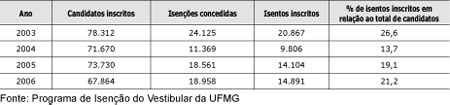 Os estudantes têm oportunidade de participar de diversas atividades na Universidade Federal de Minas Gerais. Seus direitos e deveres estão regulamentados pelo Estatuto e Regimento, estando prevista sua participação nos órgãos de deliberação superior. Também está regulamentado o funcionamento do Diretório Central dos Estudantes, dos Diretórios Acadêmicos das unidades, e dos grêmios e centros de estudos existentes em alguns cursos. Atividades sociais e culturais são realizadas por eles e também por instâncias da Universidade, como a Diretoria de Ação Cultural e a Fundação Mendes Pimentel. Acesso à Universidade O processo vestibular na Universidade Federal de Minas Gerais têm sido objeto de permanente análise e debate, no que concerne à sua adequação aos sistemas de educação básica, e à atualização dos requisitos destinados a garantir as condições de segurança na sua realização, considerando o elevado número de candidatos que a ele concorrem.[42] Mais recentemente, o aumento da demanda por vagas no ensino superior brasileiro, e a diferenciação presente na composição dessa demanda têm estado presentes com maior freqüência nesse debate.[43] Dentro da sua política para a democratização do acesso aos cursos de graduação, a UFMG conduz, desde 1971, um programa de isenção da taxa de inscrição no vestibular. Quatro critérios são considerados para a concessão dessa isenção: o tipo de escola de ensino médio freqüentada pelo candidato – pública ou privada –, o grau de escolaridade do provedor da família, a posse de bens móveis e imóveis, e a renda mensal per capita do grupo familiar. A partir do vestibular de 2005, além da isenção do valor total da taxa, foi introduzida a isenção parcial, correspondente à metade desse valor. O programa contempla tanto estudantes da escola pública como da particular, desde que cursada com bolsa integral. A média anual de inscrições nesse programa foi de 33 mil para os vestibulares de 2003 a 2006, e a de isenções anuais concedidas, de 18 mil. A Tabela 43 compara as isenções concedidas nos vestibulares desse período, com o número total de candidatos inscritos no vestibular e dos candidatos isentos que se inscreveram. Tabela 43 Programa de isenção da taxa do vestibular da UFMG – seleção para ingresso nos anos de 2003 a 2006.
