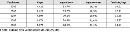 A diversificação na composição da demanda e sua relação com as dificuldades existentes para a ampliação da oferta de vagas numa instituição federal são temas presentes na definição das políticas de acesso da UFMG. Em fevereiro de 2003, a partir da análise sobre a composição socioeconômica e étnica dos candidatos e dos aprovados no vestibular, apresentada aos órgãos de deliberação superior da Universidade, o Conselho Universitário definiu como prioridade para sua política de democratização do acesso a ampliação de vagas e a abertura de cursos no turno noturno. Diversas iniciativas foram tomadas pela direção da Universidade,[45] tendo em vista atingir esse objetivo, visando principalmente os cursos com maior demanda de vagas no vestibular. O resultado obtido está apresentado na Tabela 44, que traz a distribuição de vagas relativa aos vestibulares realizados a partir de 2001, para ingresso nos anos de 2002 a 2006. Tabela 44 Vagas oferecidas, distribuição por turnos e relação candidato/vaga – 2002-2006.
