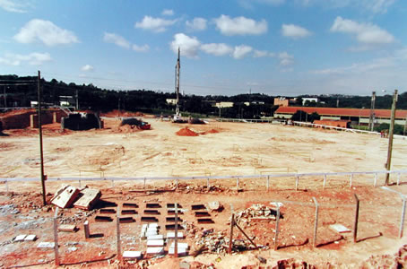 16/02/2005 Em execução as fundações profundas em estacas hélice contínuas monitoradas do Bloco 1. Ao fundo, à esquerda, o prédio do PCA1, reformado pelo Projeto Campus 2000.