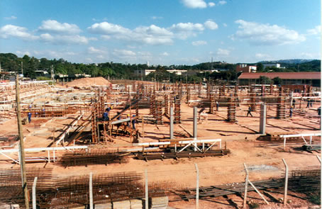 15/06/2005 Vista da obra do Bloco 1, em um conjunto de colunas que sustentarão a primeira laje em execução, algumas já concretadas. Ao fundo vemos o Coltec, o Departamento de Química e o PCA1.