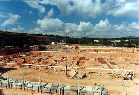 Local onde está sendo erguido o Bloco 1, com fundações profundas sendo testadas e escavações para a execução de Blocos e Cintas. À esquerda, a construção do Bloco 2. Ao fundo a construção do Bloco da Biblioteca/CCE onde as fundações profundas também já estão em testes.
