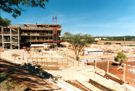 Em fase de término, a concretagem da laje de piso do quarto pavimento e iniciada a colocação de formas da quarta e última laje (cobertura). À direita, a área onde estamos construindo o Bloco 1 e a Biblioteca. Ao fundo, o PCA 1.