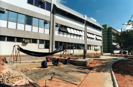 Vistas da fachada do prédio velho da E.E.F mostrando a "Ala A", construída sobre o 2º pavimento que compõe o 3º pavimento do novo prédio concluído para abrigar os departamentos de Fisioterapia e Terapia Ocupacional - FTO.