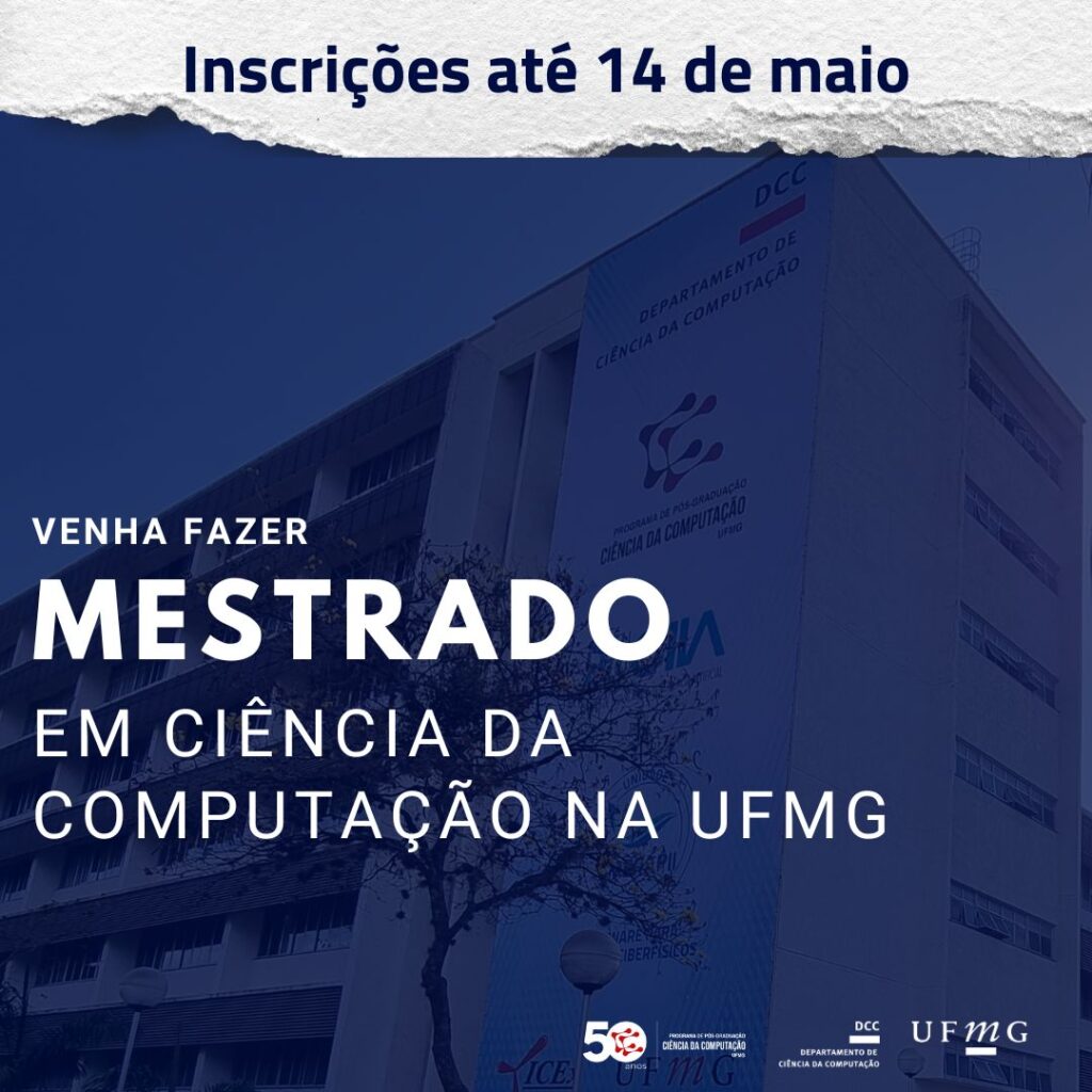 Estão abertas, até o dia 14 de maio, as inscrições para o mestrado do Programa de Pós-graduação em Ciência da Computação (PPGCC) da Universidade Federal de Minas Gerais (UFMG). No total, são oferecidas 30 vagas para início no segundo semestre de 2024. Já no doutorado, são oferecidas 40 vagas em fluxo contínuo, com inscrições até 30 de novembro deste ano.  Os candidatos, tanto para o mestrado quanto para o doutorado, podem se inscrever de forma gratuita, por meio deste link. O edital também está disponível online. Os resultados finais serão divulgados em 14 de junho.