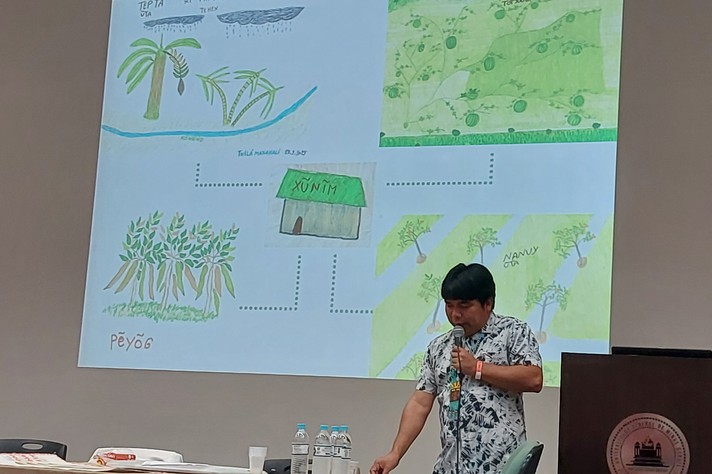 Em uma apresentação bilíngue, alternando o português e a língua maxakali, o pesquisador resgatou a história da escola maxakali, e também as violências sofridas pelo seu povo.