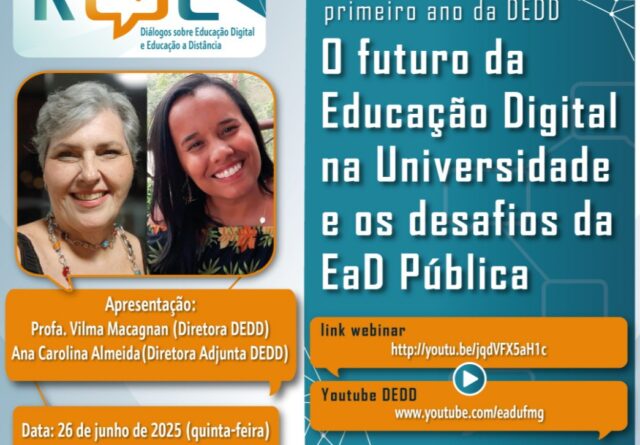 Nesta quinta-feira, 26, a partir das 14h, a Diretoria de Educação a Distância e Educação Digital (DEDD) promove webinário para discutir o futuro da educação digital na UFMG e os desafios da educação a distância pública no Brasil. A transmissão será realizada no canal da Diretoria no YouTube, onde também ficará disponível após o término do evento.