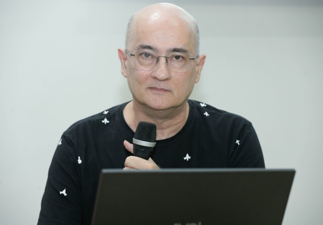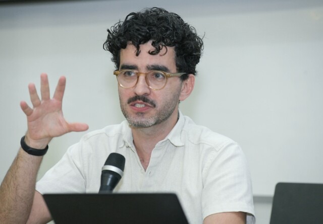 O professor Rogério Vasconcelos, da Escola de Música, abordou a IA com base em leituras sobre a história da tecnologia e da noção de pharmakon – conceito que compreende a técnica simultaneamente como remédio e veneno. “Pela primeira vez na história, temos máquinas de linguagem”, afirmou, destacando a necessidade de distinguir o funcionamento da linguagem humana daquela produzida por modelos generativos, que “espiralizam” a partir de repertórios sociais sem reproduzi-los integralmente.