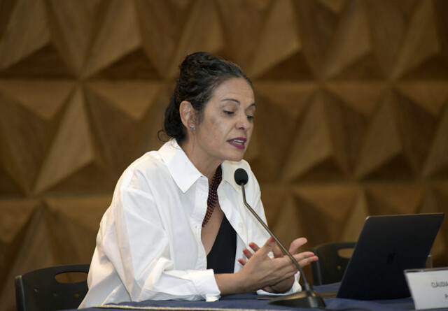 Macaé Evaristo iniciou sua fala reiterando que “não é possível pensarmos o Brasil sem pensarmos juntos com os países da América Latina e Caribe e até da África Global. Somos povos irmãos, forjados na mesma história, que carregam cicatrizes profundas mas também a força inabalável da resistência e da mudança”.