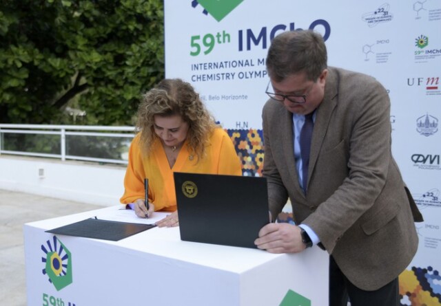 Antes da abertura da Olimpíada Internacional de Química Mendeleev, a reitora Sandra Goulart Almeida e o vice-presidente da Academia Russa de Ciências, Stepan Kalmykov, assinaram protocolo adicional para fortalecimento das atividades educacionais e científicas na área de química. O acordo aprofunda a cooperação existente entre a UFMG e a Faculdade de Química da Universidade Estadual de Moscou Lomonossov.