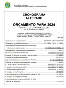 A Comissão Mista de Planos, Orçamentos Públicos e Fiscalização do Congresso Nacional, anunciou mudanças no cronograma para a aprovação do Projeto de Lei Orçamentária para 2024. Uma das alterações é no prazo para a indicação de emendas parlamentares impositivas ao Orçamento da União. O prazo anterior terminava no dia 23 de novembro, como foi anteriormente noticiado neste site.