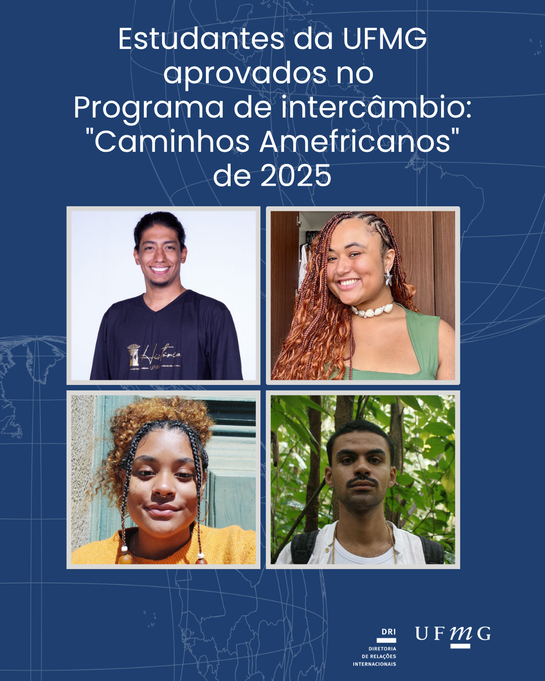 Quatro estudantes da UFMG: Lidia Nataly Santos Sousa e Bernardo Mendes de Souza – graduação em História, Ketson Lara da Silva Neres e Camila Freitas Gomes – graduação em Pedagogia, foram aprovados no Programa de intercâmbio “Caminhos Amefricanos” de 2025.