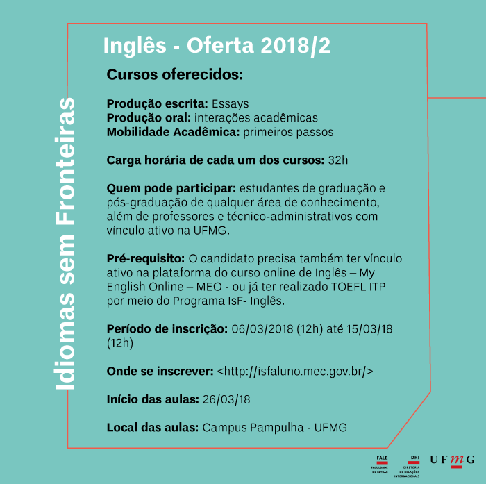 Interessados em realizar cursos presenciais gratuitos de Inglês ofertados pelo programa Idiomas sem Fronteiras, em parceria com a Faculdade de Letras, poderão se inscrever, até o dia 15 de março, para a oferta 2018/2.