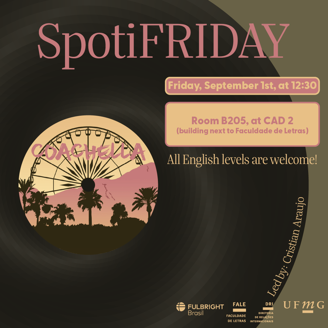 O Setor de Proficiência Linguística da Diretoria de Relações Internacionais convida toda comunidade acadêmica a participar na sexta-feira, dia 01 de setembro, às 12h30, de mais uma edição do “Spotifriday”. Neste próximo encontro o tema será “COACHELLA”, grande festival de música que acontece tradicionalmente no deserto do Colorado na região da Califórnia. O encontro acontecerá na sala B205 do CAD 2 (prédio ao lado da Faculdade de Letras).