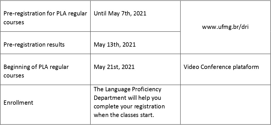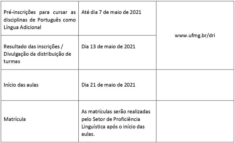 O Setor de Proficiência Linguística da Diretoria de Relações Internacionais (DRI) e a Faculdade de Letras (FALE) da Universidade Federal de Minas Gerais (UFMG) anunciam que estão abertas as pré-inscrições para as disciplinas regulares de Português Língua Adicional (PLA), a serem oferecidas ao longo do primeiro semestre de 2021.