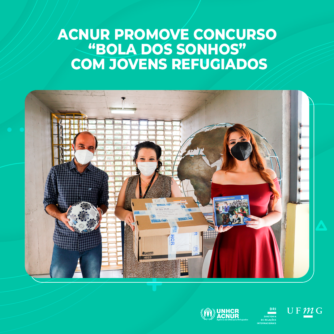 A UFMG foi presenteada com uma dessas bolas com objetivo de mobilizar apoio para programas esportivos para comunidades de pessoas em situação de deslocamento forçado e demonstrar o poder transformador do esporte. A doação foi entregue pela Diretoria de Relações Internacionais – DRI – por meio da servidora Luciana Fiuza, ao Centro Pedagógico da UFMG, para o diretor Marcos Elias Sala e a vice-diretora Luiza Santana Chaves.