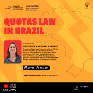 A Diretoria de Relações Internacionais (DRI) da UFMG promove, no dia 29 de setembro, às 19h (Brasília), a aula inaugural da Formação Transversal em Estudos Internacionais (FTEI) deste 2º semestre de 2022, com a palestra intitulada “Quotas Law in Brazil”, ministrada pela professora Ana Paula Karruz.