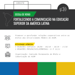 A Associação de Universidades Grupo Montevidéu (AUGM) convida as universidades para participar da Escola de Verão cujo tema é “Fortalecimento da comunicação na Educação Superior da América Latina”. A proposta busca promover, por meio de metodologias participativas e colaborativas, uma cultura de comunicação, assim como reconhecer e valorizar a diversidade linguística e cultural latino-americana. A discussão sobre a temática partirá de uma perspectiva de comunicação emancipadora, responsável, acessível e inclusiva para todos e todas.