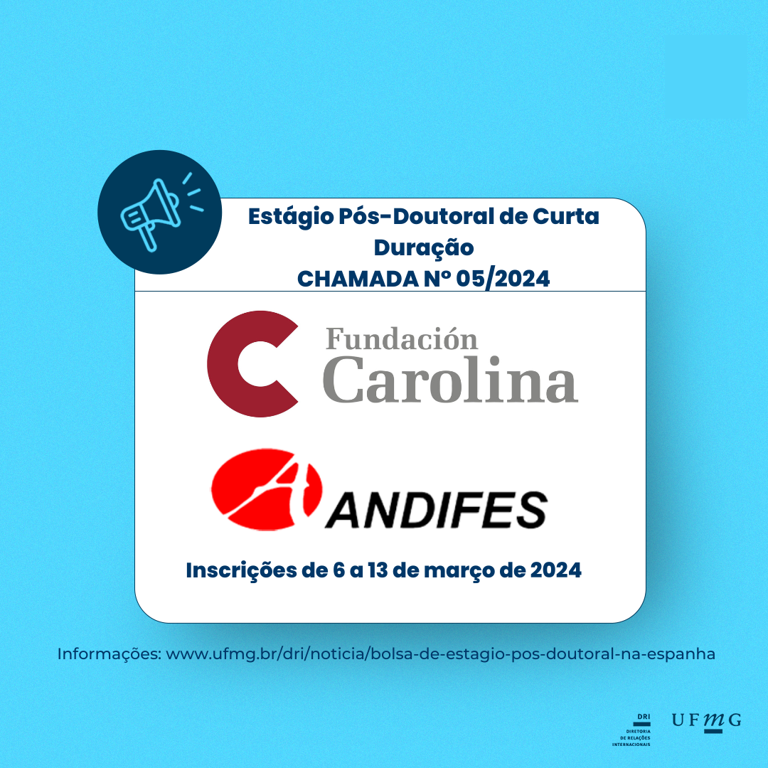 A Diretoria de Relações Internacionais (DRI) da Universidade Federal de Minas Gerais (UFMG) torna pública a Chamada N° 05/2024 de pré-seleção para indicação de 01 (um) candidato a bolsa conjunta voltada à realização de Estágio Pós-Doutoral de Curta Duração de professores e técnicos administrativos da UFMG, em universidades espanholas, com projetos alinhados às chamadas “Bolsas de Estudo ODS, que mudam vidas”.