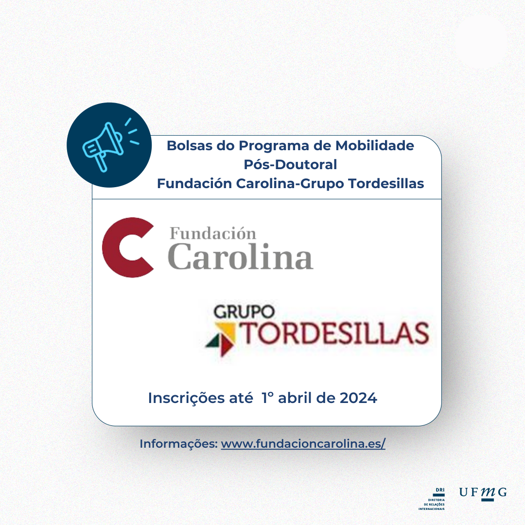 Estão abertas as candidaturas às bolsas do Programa de Mobilidade Pós-Doutoral do Grupo Tordesilhas/Fundação Carolina até dia 1º de abril (horário da Espanha). O programa disponibiliza a realização de pesquisas de curto período em universidades espanholas. Serão ofertadas 10 bolsas com duração mínima de um mês, sendo no máximo três, no período entre 1º de setembro de 2024 a 31 de julho de 2025.
