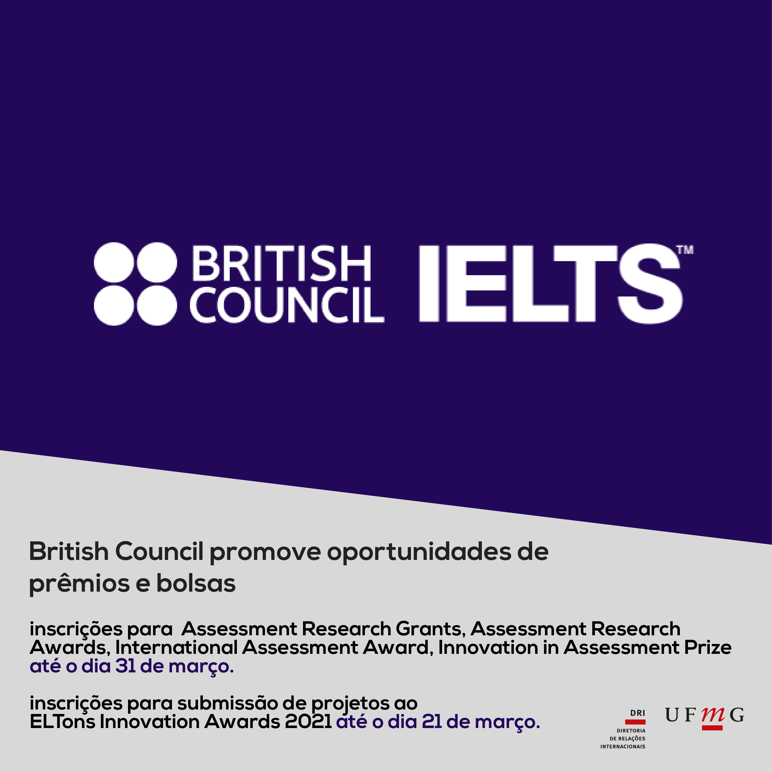 Com o objetivo de reconhecer realizações e inovações no campo da avaliação e do trabalho com idiomas, o British Council está com inscrições abertas até o dia 31 de março, com prêmios e bolsas que se destinam tanto a estudantes pesquisadores, como a pesquisadores mais experientes na área da avaliação.