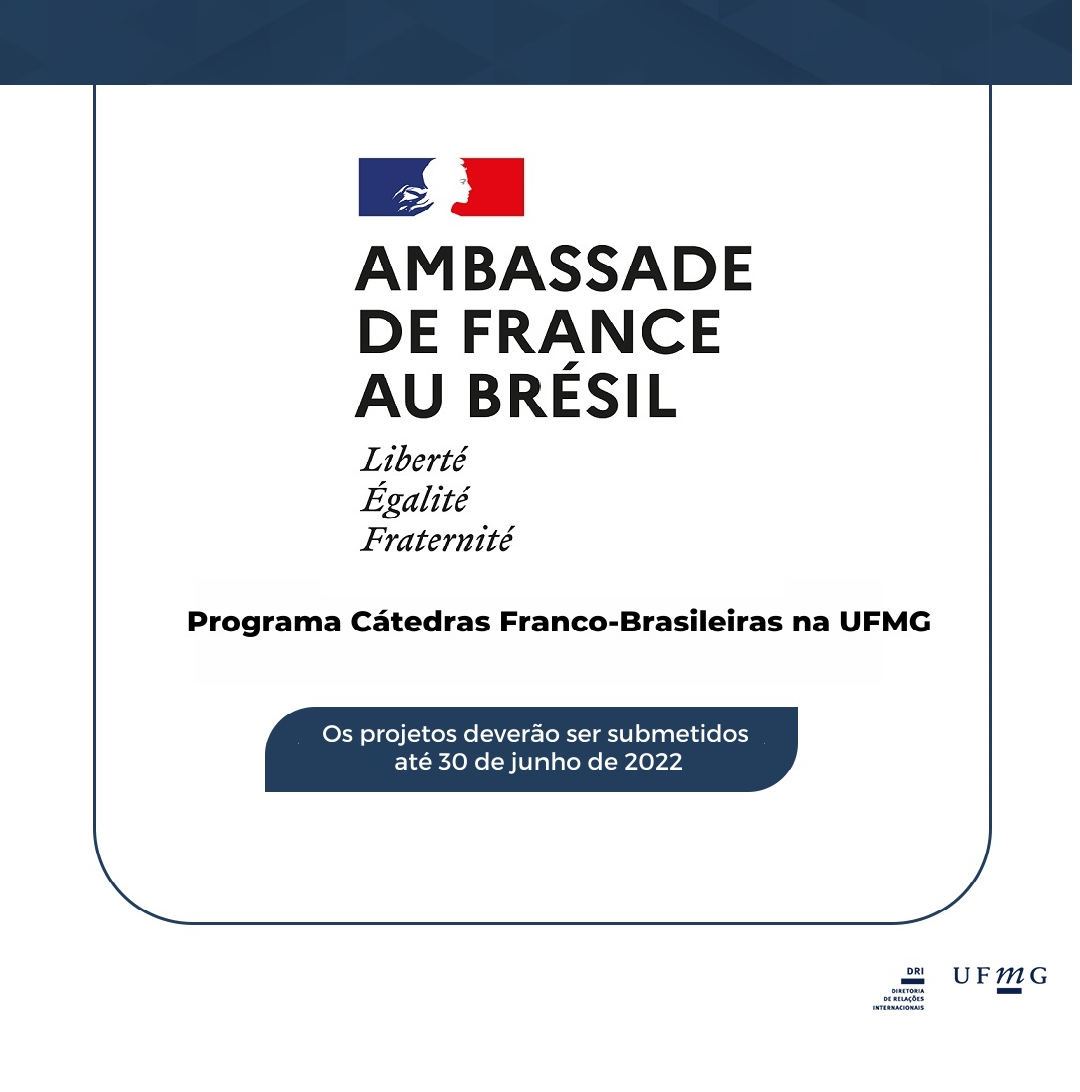 A Universidade Federal de Minas Gerais (UFMG), em parceria com a Embaixada da França no Brasil, lança mais uma edição do Programa Cátedras Franco-Brasileiras na UFMG, a fim de promover a atuação, junto à UFMG, de professores(as) e/ou pesquisadores(as), vinculados(as) a instituições francesas de ensino superior e de pesquisa.