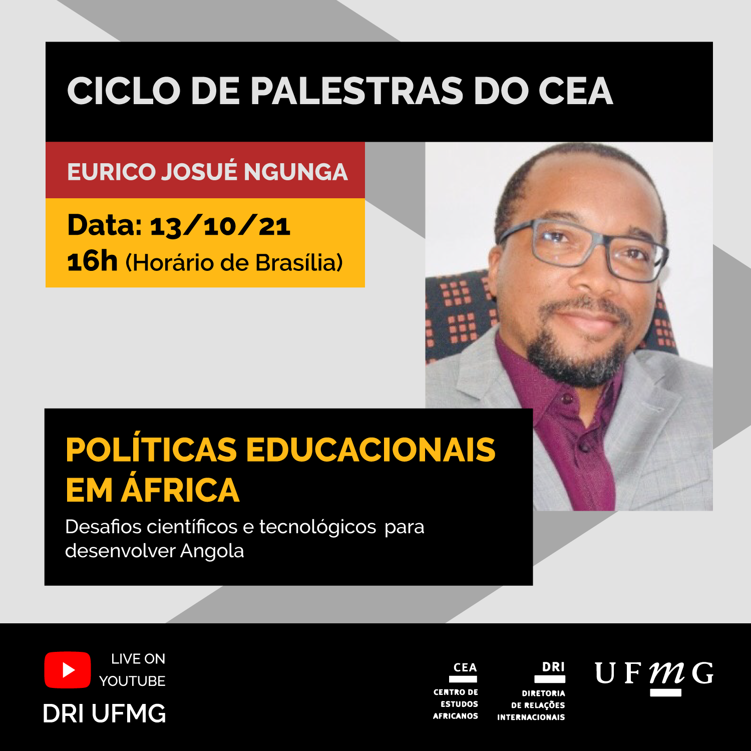 A Diretoria de Relações Internacionais convida a todos para a palestra Políticas Educacionais em África: Desafios Científicos e Tecnológicos para desenvolver Angola, promovida pelo Centro de Estudos Africanos e ministrada pelo professor Eurico Josué Ngunga. O evento acontecerá no dia 13 de outubro, às 16h (horário de Brasília) e será transmitida pelo canal de Youtube da DRI/UFMG.