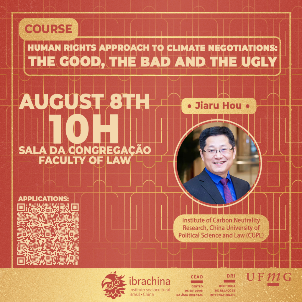 Centro de Estudos da Ásia Oriental da Diretoria de Relações Internacionais (DRI) da UFMG promove curso “Human Rights Approach to Climate Negotiations: the good, the bad and the ugly”, com professor Jiaru Hou, do Institute of Carbon Neutrality Research, China University of Political Science and Law (CUPL), no dia 08 de agosto, às 10h, na Sala Congregação, Faculdade de Direito.