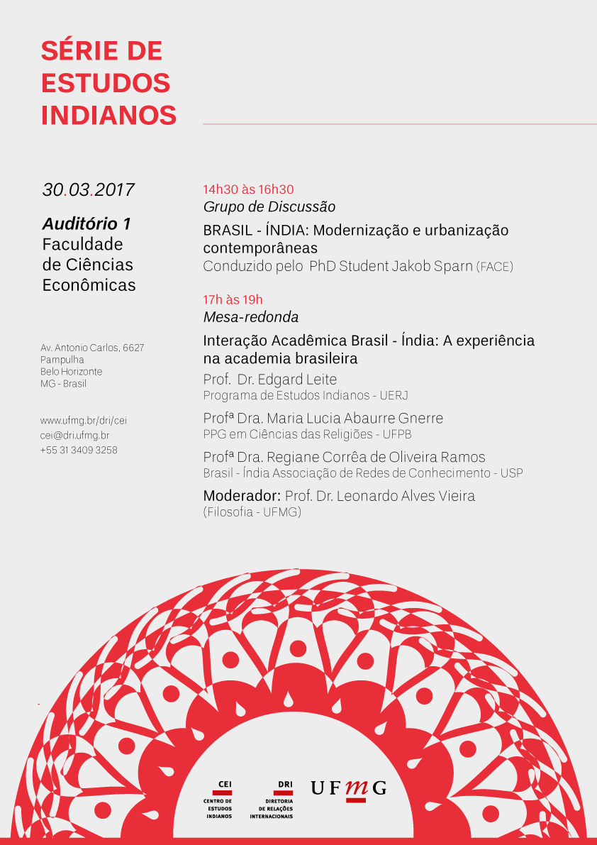 O Centro de Estudos Indianos (CEI) da DRI/UFMG dará início aos eventos da Série de Estudos Indianos no dia 30 de março, quinta-feira. A programação do evento conta com um Grupo de Discussão conduzido pelo aluno de doutorado Jakob Span (FACE).