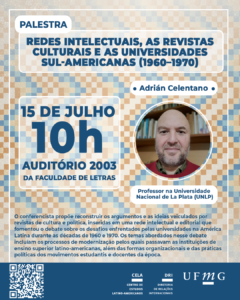 O Centro de Estudos Latino-Americanos (CELA) promoverá, no dia 15/07/2025, às 10h, a palestra “Redes intelectuais, as revistas culturais e as universidades sul-americanas (1960–1970)”, ministrada pelo professor Adrián Celentano, da Universidade Nacional de La Plata (UNLP). O evento será no Auditório 2003 da Faculdade de Letras (FALE) da UFMG.