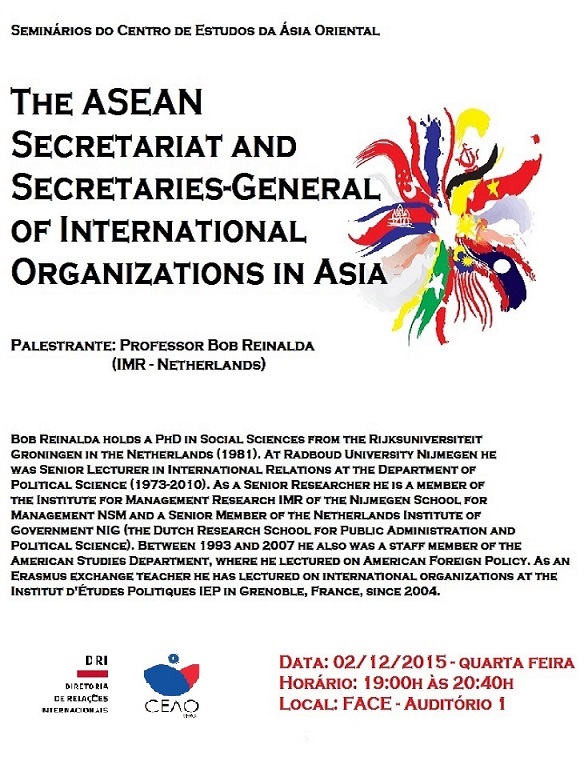 No evento, o professor doutor Bob Reinalda do Institut d’Études Politiques (IEP) ministrará a palestra “The ASEAN Secretariat and Secretaries-General of International Organizations in Asia.”