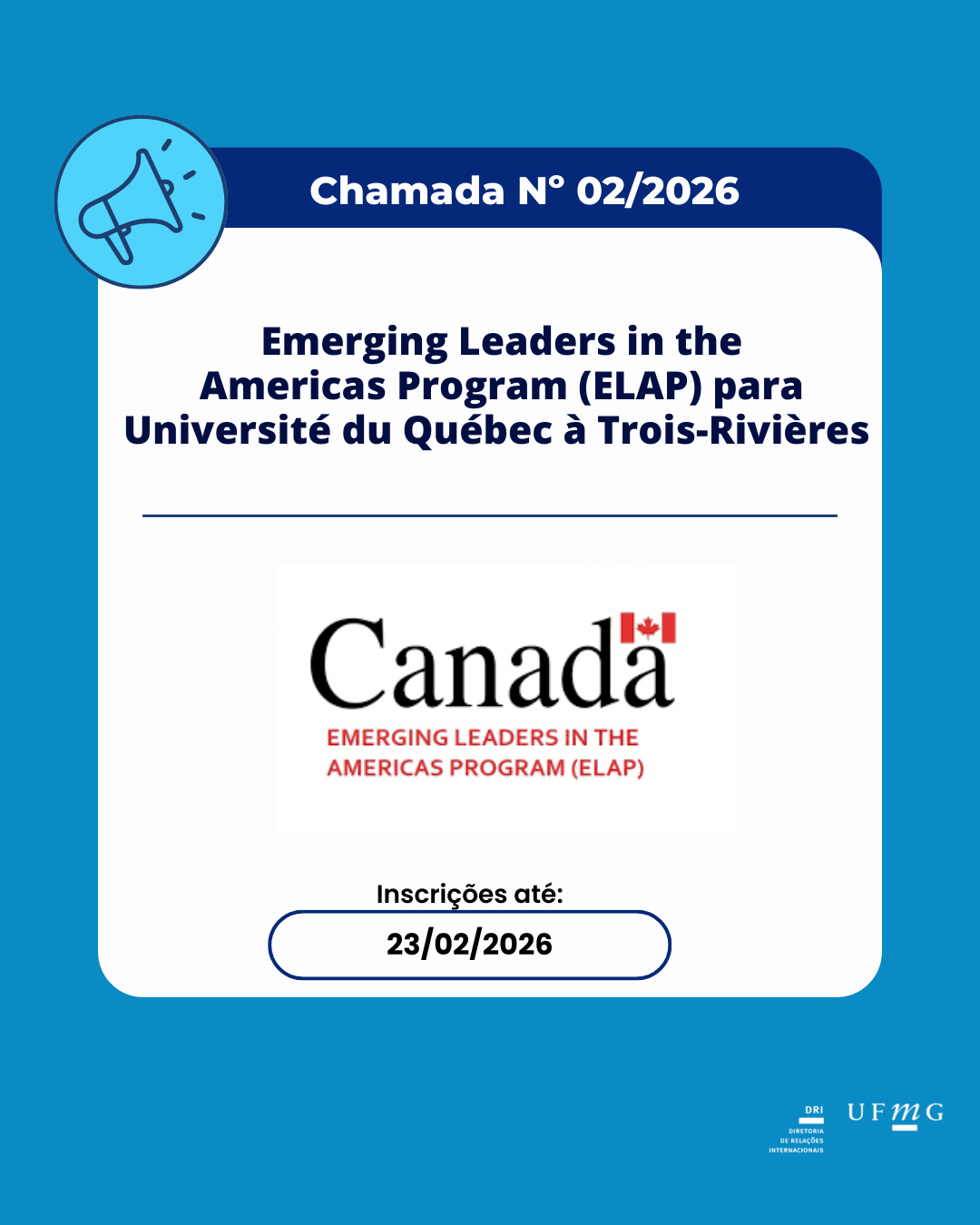 A Diretoria de Relações Internacionais (DRI) da Universidade Federal de Minas Gerais (UFMG) torna pública a Chamada referente à indicação de 02 estudantes de graduação para o Emerging Leaders in the Americas Program (ELAP), Canadá, para realização de um semestre de estudos na Université du Québec à Trois-Rivières. As informações adicionais podem ser encontradas no site oficial do programa.