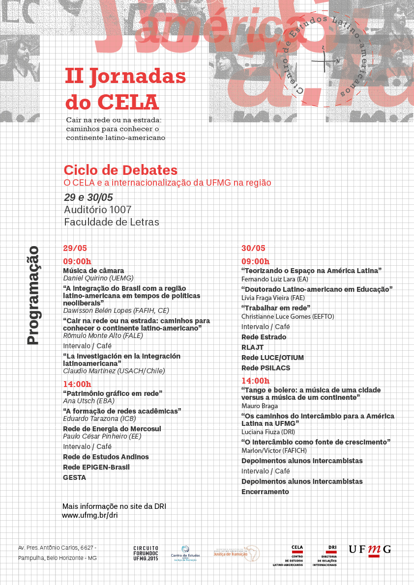 O auditório 1007 da Faculdade de Letras (FALE) da UFMG vai receber, nos dias 29 e 30 de maio, o Ciclo de Debates: O CELA e a internacionalização da UFMG na região com o intuito de apresentar para estudantes e professores da UFMG as oportunidades de mobilidade internacional, que podem ser realizadas na América Latina, por meio das redes acadêmicas ligadas ao Centro de Estudos Latino-Americanos.