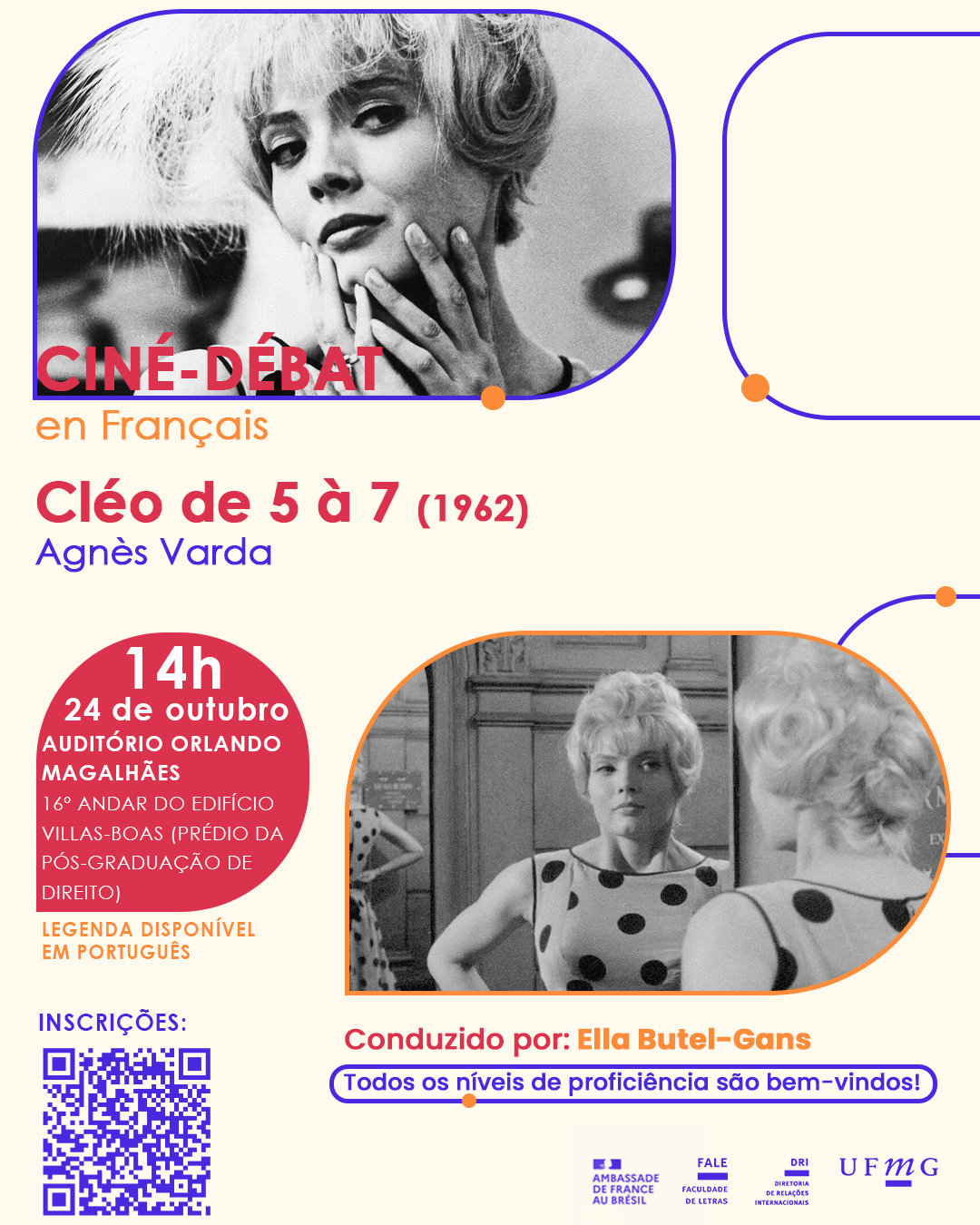 O Setor de Proficiência Linguística da Diretoria de Relações Internacionais (DRI), com apoio da Rede Francófona da Faculdade de Direito da UFMG, convida toda a comunidade acadêmica a participar, no dia 24 de outubro de 2025, a partir das 14h, do próximo encontro do CINÉ-DÉBAT en Français. Nesta edição, será exibido o longa-metragem Cléo de 5 à 7 (1962), dirigido por Agnès Varda.