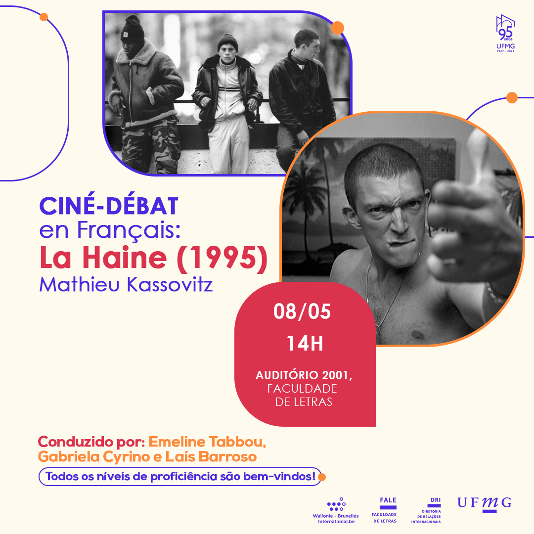 O Setor de Proficiência Linguística da Diretoria de Relações Internacionais (DRI-UFMG) convida a toda comunidade acadêmica a participar no dia 08 de maio, das 14h às 16h, de mais um CINÉ-DÉBAT en Français. Neste próximo encontro, será exibido o filme “La Haine” (O Ódio, no Brasil). O filme é um drama em preto e branco, escrito e dirigido por Mathieu Kassovitz e lançado em 1995. É um grande clássico do cinema francês, abordando temas de cultura urbana e exclusão social. O filme será exibido com legenda em português.