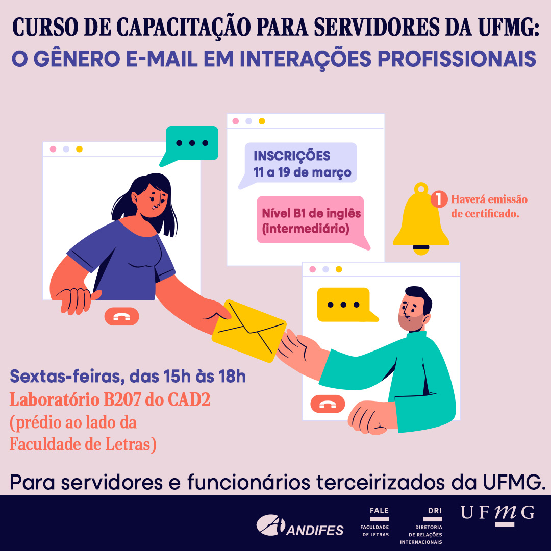 A Rede Andifes-ISF, com o apoio da Diretoria de Relações Internacionais (DRI) e da Faculdade de Letras (FALE) da Universidade Federal de Minas Gerais (UFMG), está ofertando o curso de capacitação: “O gênero e-mail em interações profissionais“, tendo como objetivos: