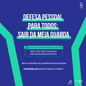 Na próxima sexta-feira, dia 30 de setembro de 2022, Brenda Arellano, assistente de ensino de língua inglesa Fulbright (English Teaching Assistants – ETAs), promove aulas de defesa pessoal para todos com a temática: “Sair da Meia Guarda”.