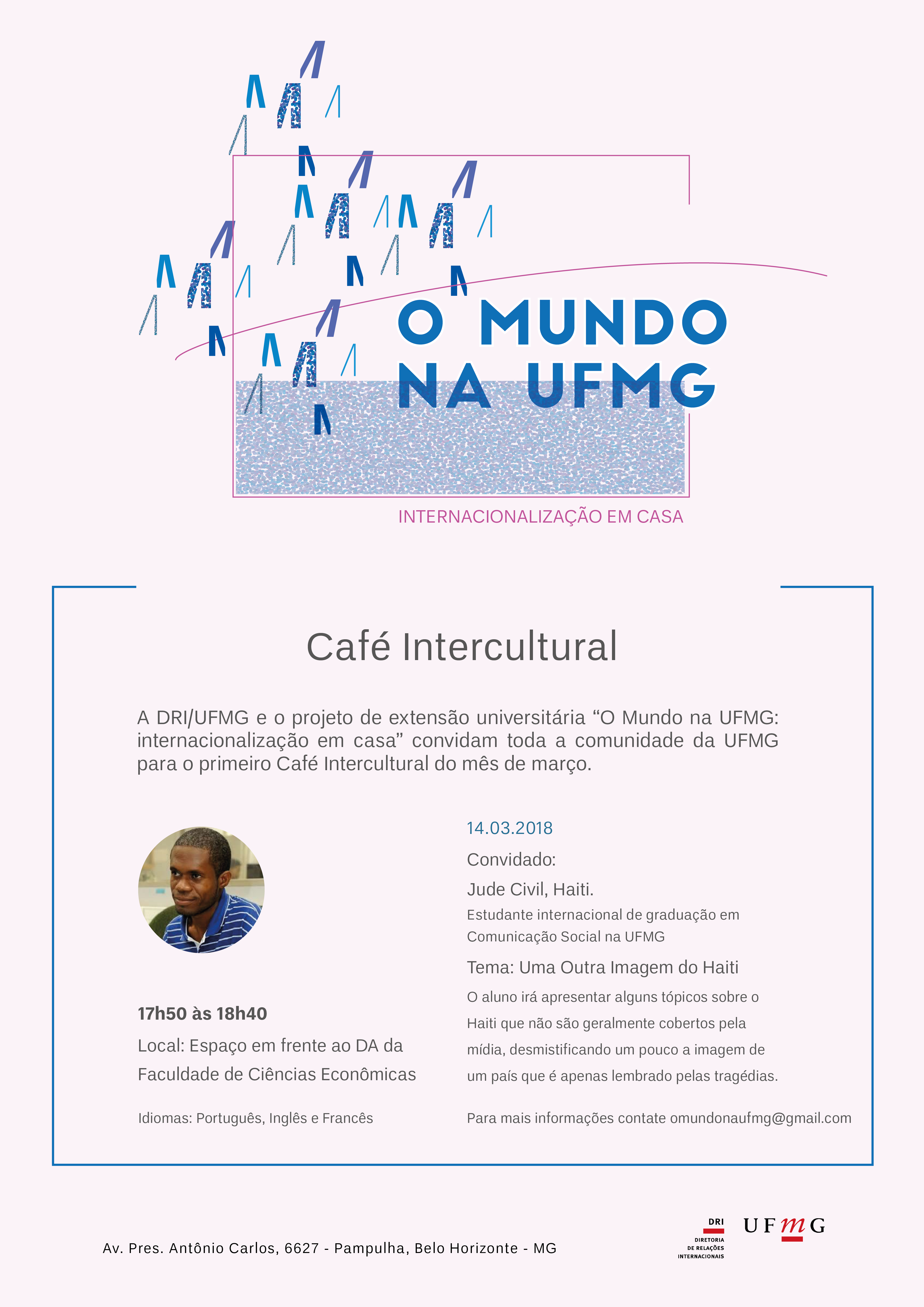 O Setor de Acolhimento da Diretoria de Relações Internacionais da UFMG promoverá, no dia 14 de março, mais uma edição do Café Intercultural. O evento acontecerá às 17h50, em frente ao Diretório Acadêmico da Faculdade de Ciências Econômicas.