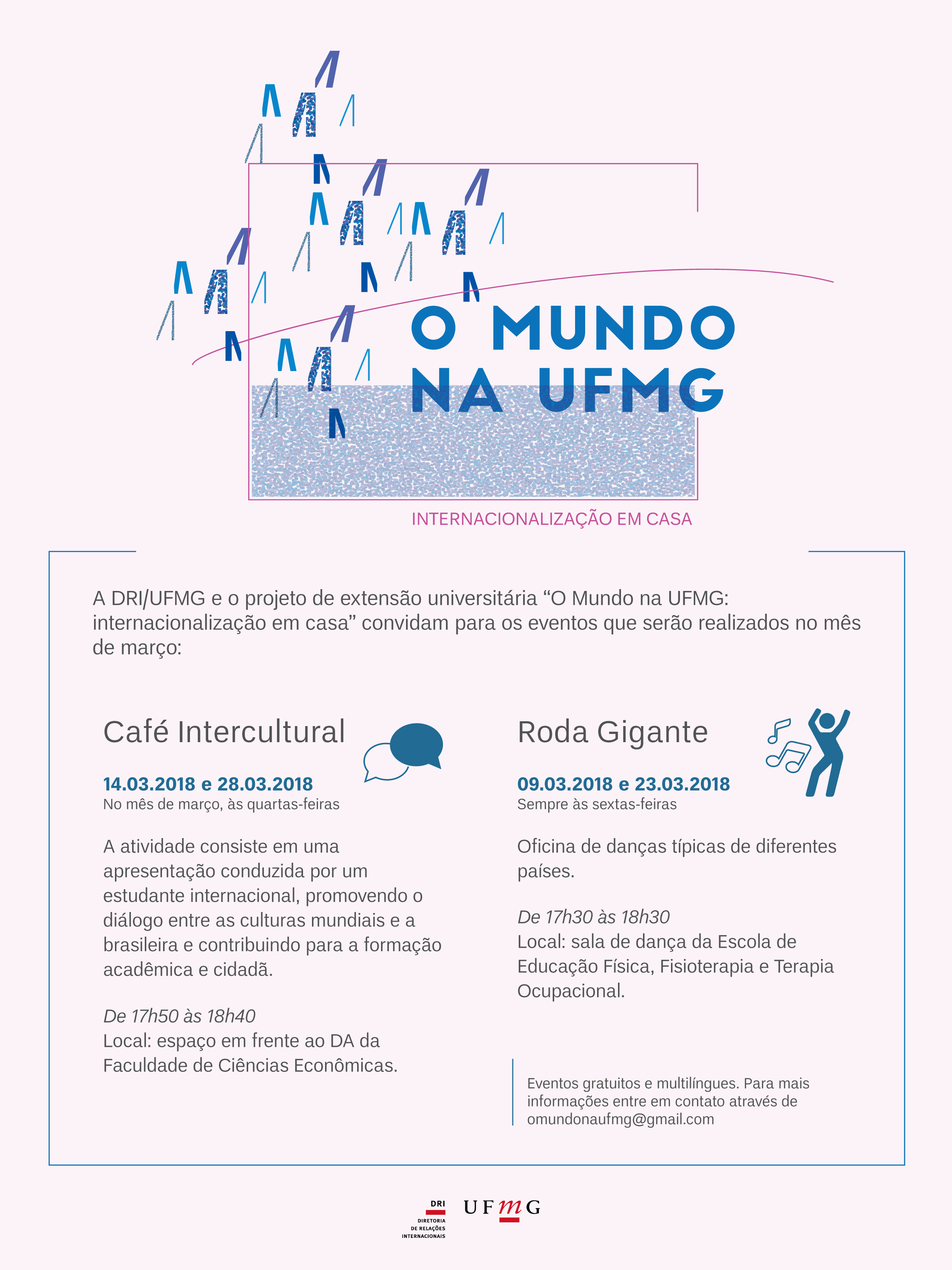 O Setor de Acolhimento da Diretoria de Relações Internacionais da UFMG promoverá, no dia 23 de março, uma nova edição do Projeto Roda Gigante, que contará com oficinas de danças típicas de diferentes países, ofertadas por estudantes internacionais da UFMG.