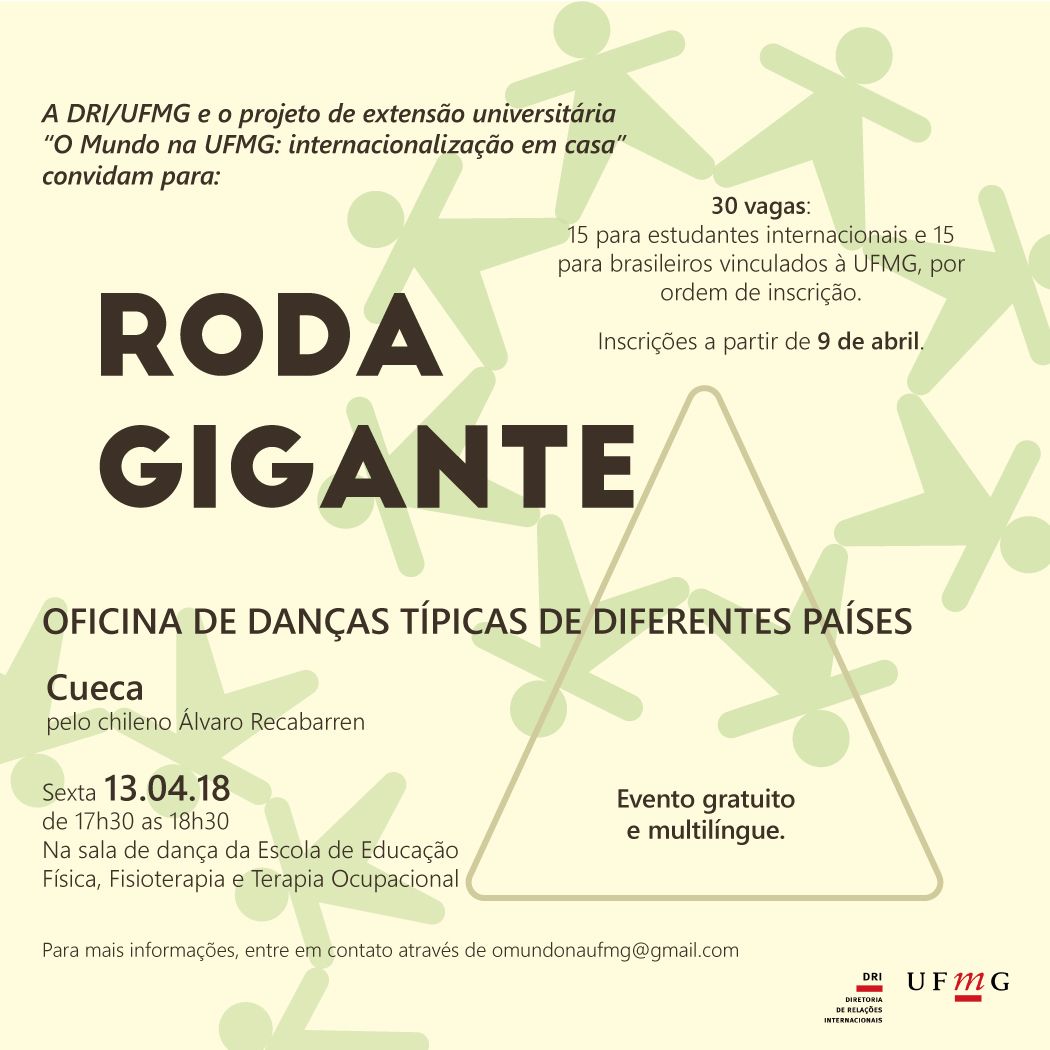 O Setor de Acolhimento da Diretoria de Relações Internacionais da UFMG promoverá, no dia 13 de abril, sexta-feira, uma nova edição do Projeto Roda Gigante, que contará com oficinas de danças típicas de diferentes países, ofertadas por estudantes internacionais da UFMG.