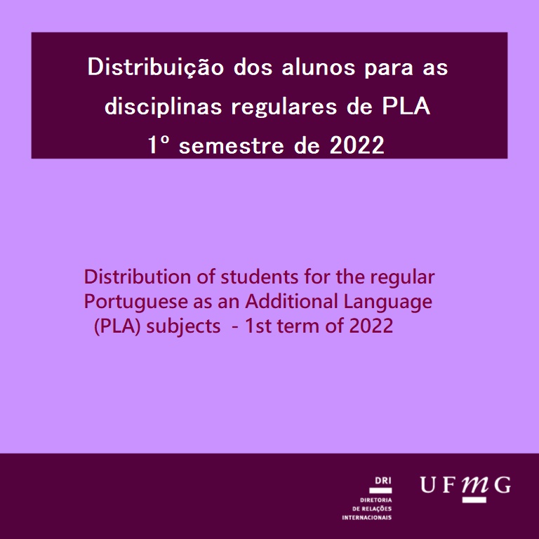 O Setor de Proficiência Linguística da Diretoria de Relações Internacionais (DRI) e a Faculdade de Letras (FALE) da Universidade Federal de Minas Gerais (UFMG) apresentam a distribuição de alunos para as disciplinas regulares de Português Língua Adicional (PLA) do 1º semestre de 2022.