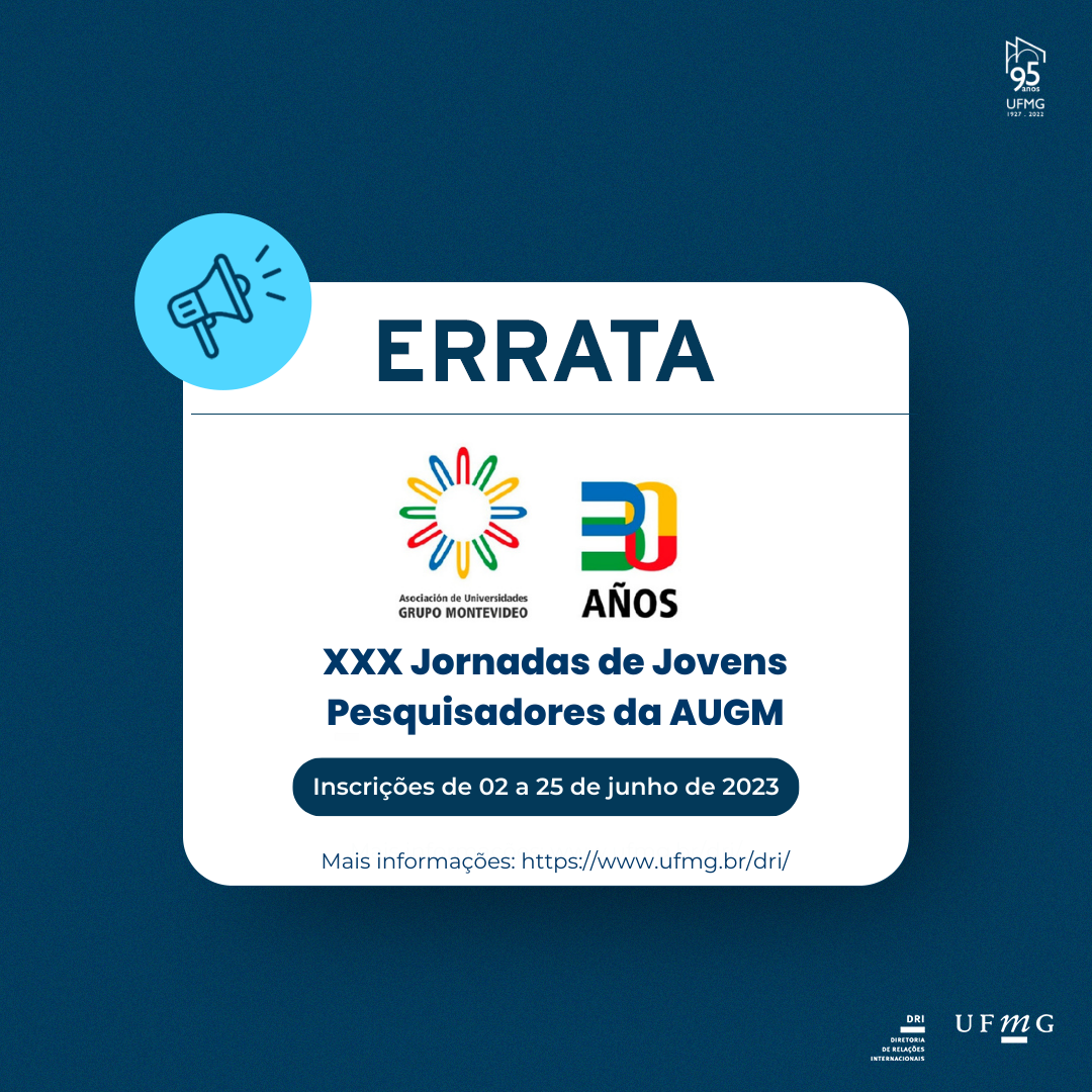 A Diretoria de Relações Internacionais (DRI) da Universidade Federal de Minas Gerais (UFMG) torna pública esta “Errata 01” à Chamada 07_2023, publicada em 29 de maio de 2023, para seleção de trabalhos de pesquisadores da UFMG interessados em se apresentar nas 30ª Jornadas de Jovens Pesquisadores da Associação de Universidades do Grupo Montevidéu (AUGM), que serão realizadas nos dias 11, 12 e 13 de outubro de 2023 na Universidad Nacional de Asunción (UNA), em San Lorenzo, Paraguai.
