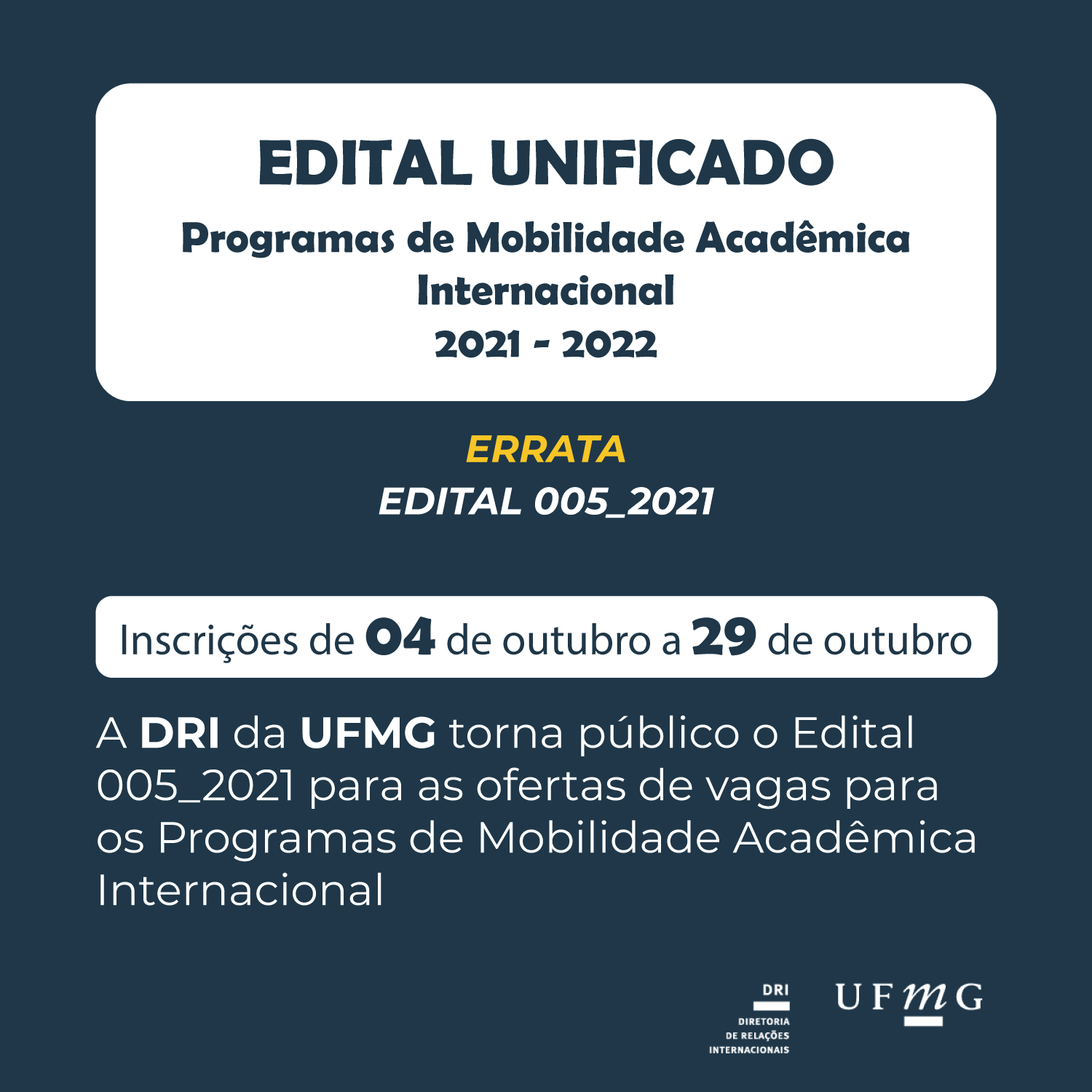 A Diretoria de Relações Internacionais (DRI) da Universidade Federal de Minas Gerais (UFMG) torna público a Errata 01, que altera o início das inscrições para o dia 4 de outubro, referente ao Edital Unificado para participação em Programas de Mobilidade Internacional 2021-2022, Edital 005/2021, publicado em 20 de setembro de 2021.