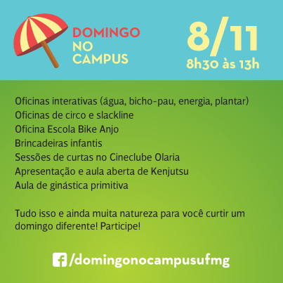 As portas da UFMG se abrem mais uma vez para a comunidade externa no próximo Domingo no Campus, dia 8 de novembro. O evento, que chega a sua 4ª edição, reforça a dimensão pública da Universidade e é um convite para a apropriação do espaço da UFMG pela comunidade, com atividades recreativas, culturais, de lazer e esporte.